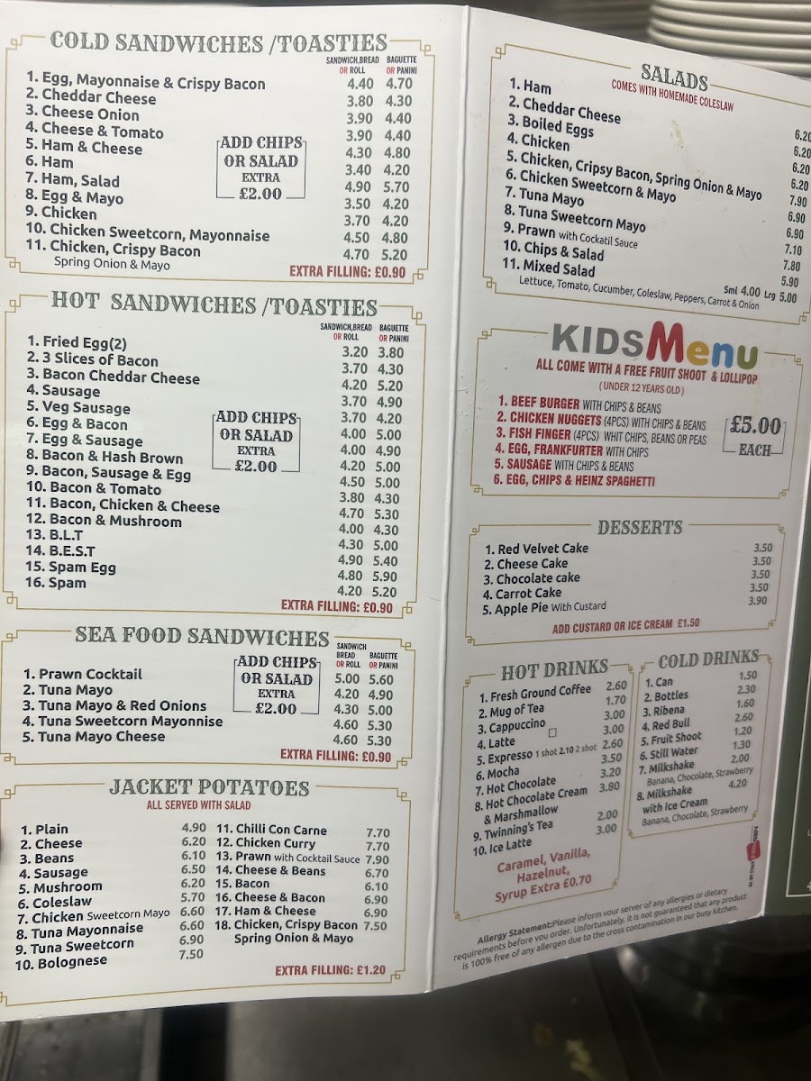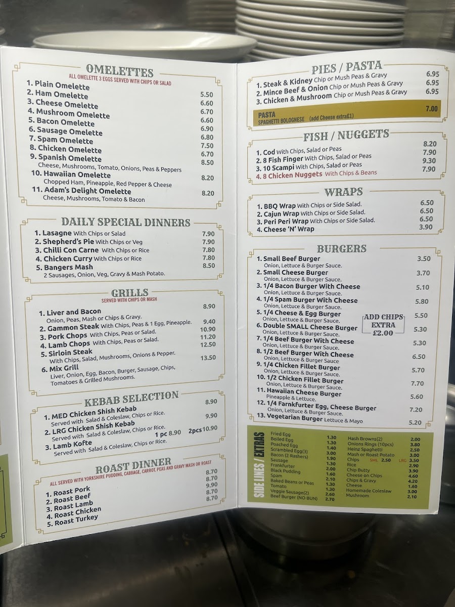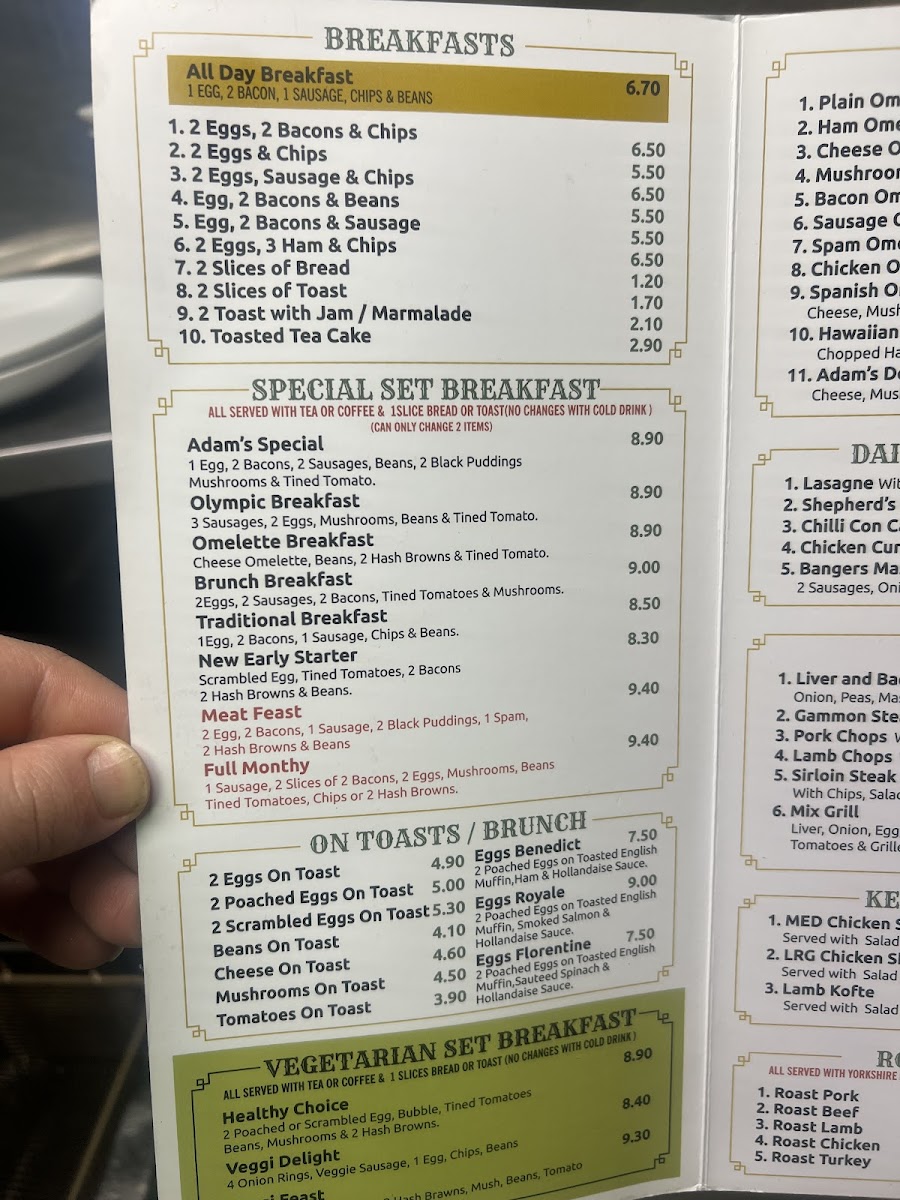 Adams Cafe & Restaurant at 49 Barnsley Rd offers a menu that balances hearty classics with comforting homemade options. Breakfast choices range from simple plates like Egg & Bacon and 2 Eggs, Sausage & Chips to indulgent Special Set Breakfasts such as Adam's Special and the Olympic Breakfast, alongside customizable omelettes including Ham Omelette and Mushroom Omelette. The lunch and dinner selections feature Daily Special Dinners like Lasagne and Chili Con Carne, alongside a Grill section with Sirloin Steak and Mix Grill, and a Chicken Selection offering both medium and large Shish Kebabs. Roast dinner enthusiasts can enjoy Roast Beef, Roast Chicken, or Roast Lamb, while vegetarians are catered for with options such as Veggie Sausages, Eggs, Hashbrowns, Mushrooms, Beans, and Onion Rings. Pies including Steak & Kidney and Chicken & Mushroom Pie, as well as Spaghetti Bolognese, Piri Piri Wraps, and Fish or Nuggets like Cod, Chips and Garden Peas, offer satisfying variety. The burger lineup features Small Beef Burger With Chips and Bacon Cheese Burger, while sides, hot and cold sandwiches, seafood rolls, jacket potatoes, and fresh salads ensure something for every palate. For younger diners, Kid’s Burger With Chips & Beans and Kid’s Chicken Nuggets are available, while babies can enjoy Mash & Gravy. Desserts such as Apple Pie, Strawberry Cheesecake, and Chocolate Gateau round out the meal, complemented by drinks from Coffee and Latte to iced options like Ice Latte, as well as elegant brunch offerings including Eggs Benedict, Eggs Royale, and Eggs Florentine. Overall, the menu reflects a mix of traditional comfort food and versatile choices, all presented with clear pricing and generous portions.